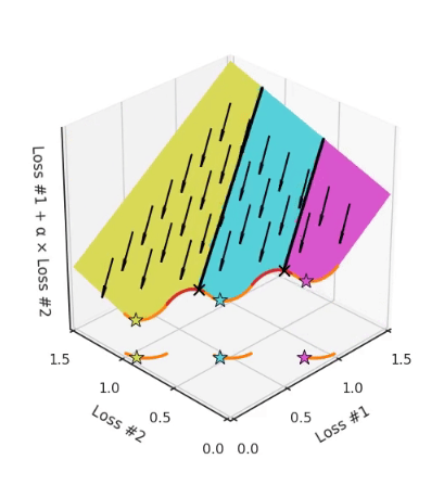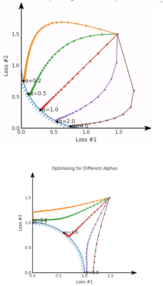 Żeby wyjaśnić problem trzeba patrzeć na krzywą Pareto (czyli zbiór wszystkich Rozwiązanie optymalne w sensie Pareto). Jeśli ta krzywa jest wypukła to model nauczy się ignorować jedną z funkcji strat. Na górze wklęsła, na dole wypukła: