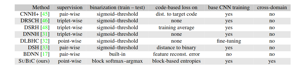 SUBIC zawiera zgrabne podsumowanie i porównanie kilku publikacji robiących supervised hashing: