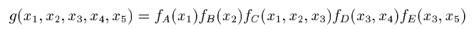 Factor graph to jest sposób zapisu wzoru na wyliczenie wartości funkcji, tzn. funkcja reprezentowana przez graf równa jest iloczynowi wszystkich funkcji zwartych w grafie. W powyższym przykładzie chcąc obliczyć wartość funkcji wymnażamy wartości funkcji . Źródło: Probabilistic Modeling and Inference at Scale — Ralf Herbrich (Part 1)