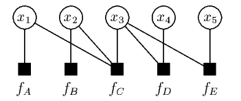 Factor graph w ogólności to graf dwudzielny, który ma dwa typy wierzchołków - reprezentujące zmienne (zazwyczaj kółka) oraz reprezentujące funkcje (zazwyczaj czarne kwadraty). Kwadrat X jest połączony z kółkiem Y gdy funkcja X przyjmuje na wejściu zmienną Y. Przykład funkcji i factor grafu: