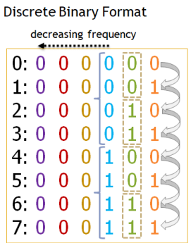 Zwróćmy uwagę, że częstotliwość zmian między 0 a 1 jest różna dla różnych kolumn (maleje idąc od prawej do lewej strony).