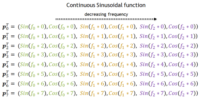 O sin-cos positional encoding można myśleć jak o ciągłej wersji enkodowania binarnego liczb, tzn. chcąc zamienić liczby od 0 do 8 w embedding o wymiarze moglibyśmy zakodować te liczby po prostu binarnie: