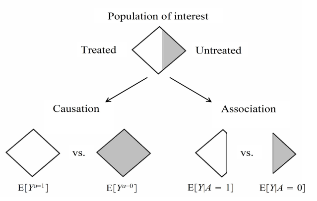 Jeśli mamy dane, dla których dla części populacji mamy dane nt. co się stało jeśli ktoś był leczony (treated), a dla reszty populacji mamy dane nt. co się stało jeśli ktoś nie był leczony (untreated), to możemy jedynie mówić o association.