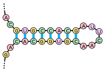 Przez to, że RNA ma jedną nitkę, RNA skleja się samo ze sobą - pary nukleotydów łączą się miejscami ze sobą tworząc strukturę 3D (RNA wygina się, żeby połączyć ze sobą jak najwięcej par), podobnie jak Białko. Sparowane regiony nazywają się stems, a te niesparowane loops: