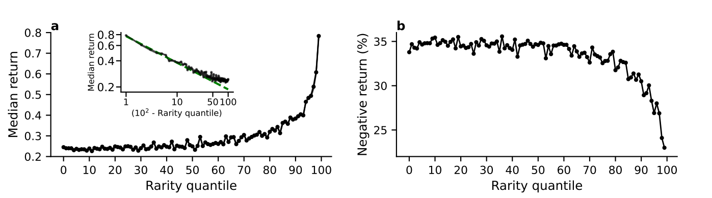 Rzadkość jest pozytywnie skorelowana z ceną i negatywnie skorelowana z liczbą transkacji. Sprawdzili to na wielu różnych kolekcjach. W dodatku rzadkość jest pozytwnie skorelowana z procentowym zwrotem z inwestycji oraz negatywnie skorelowana z p-stwem negatywnego zwrotu z inwestycji: